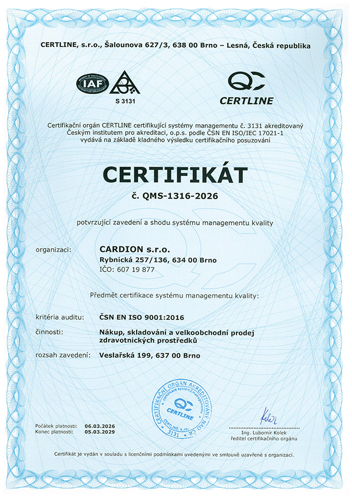 - Systém managementu pro zdravotnické prostředky, dle ČSN EN ISO 13485:2016 (jsme držitelé certifikátu od 17. 5. 2010)
